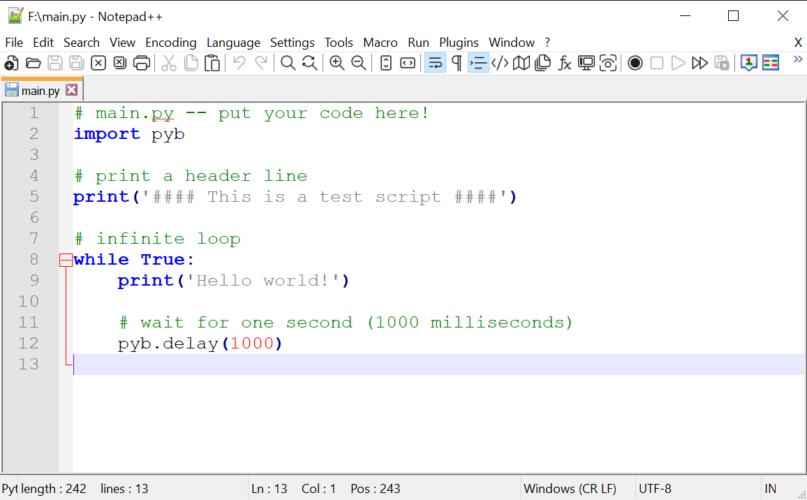 # main.py -- put your code here!importpyb# print a header lineprint('#### Test ####')# infinite loopwhileTrue:print('Hello world!')# wait for one second (1000 milliseconds)pyb.delay(1000)