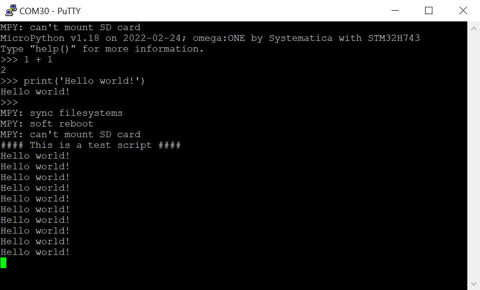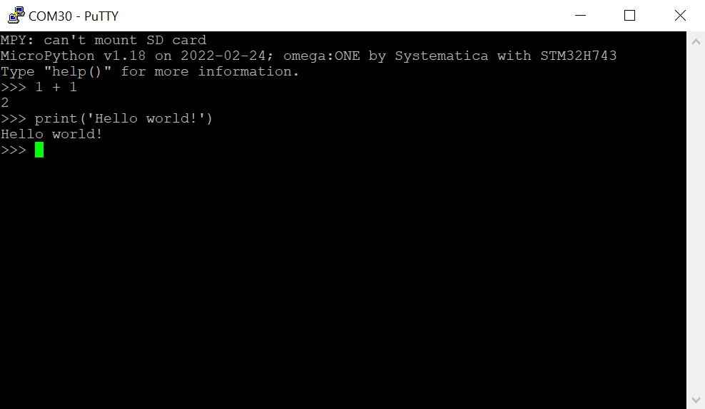 The interactive prompt REPL can be accessed with any terminal program, such as PuTTY, by opening the board’s USB serial port, which is automatically created when the board is connected to a PC: