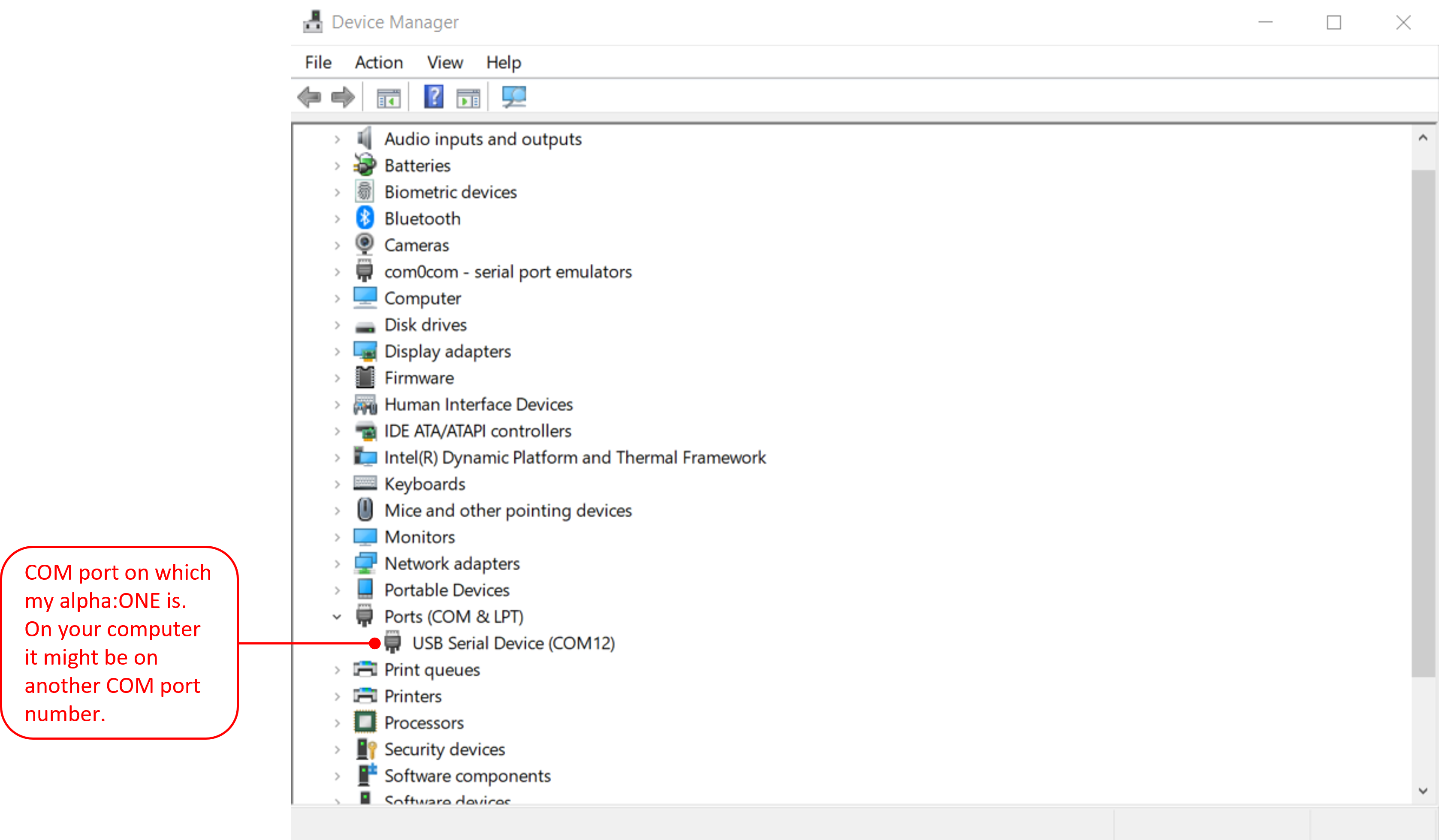 With the Device Manager still open, connect the board to your computer with the USB cable and you’ll see the new COM port appear - remember this COM port number.