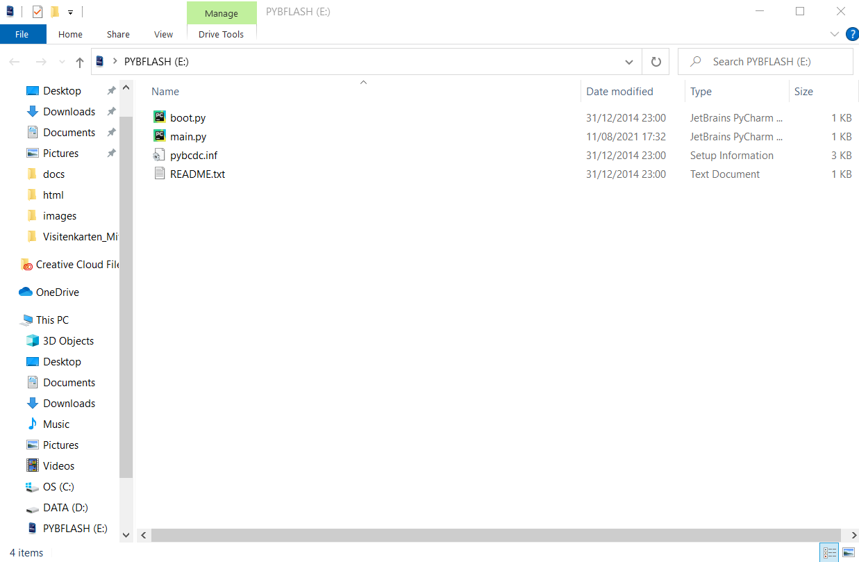 (If File Explorer doesn’t pop up automatically, open it manually and you’ll see PYBFLASH under your computer’s drives).