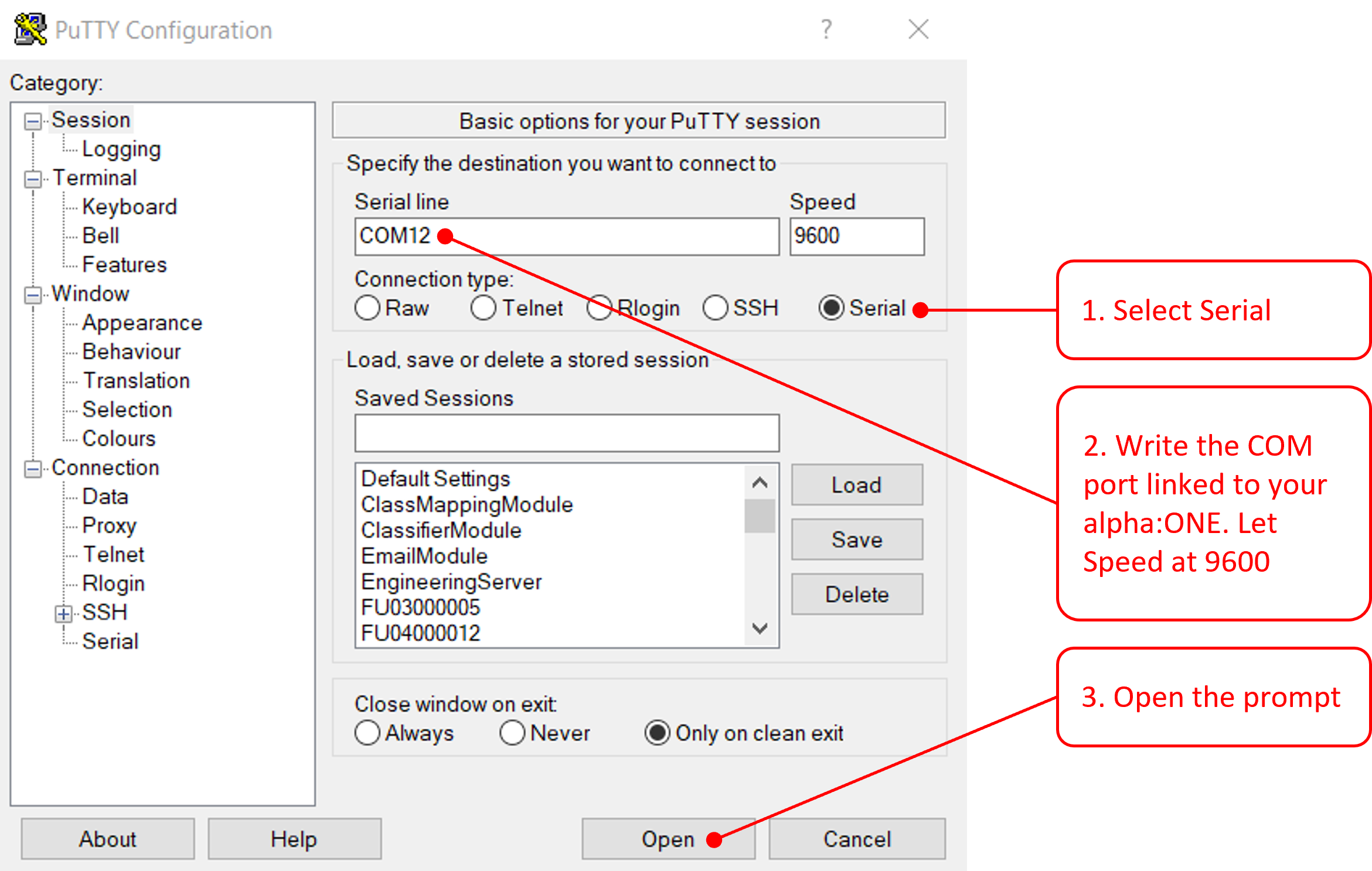 Open PuTTY, select Serial, insert the COM port corresponding to the board and then click the Open button.
